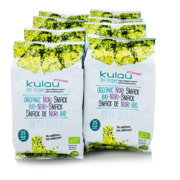 Der Bio Nori-Snack von Kulau ist ein wahres Genuss-erlebnis für den europäischen Gaumen. Köstliche, knusprige Norialgenblätter, die auf der Zunge zergehen und nichts als den milden Geschmack des Meeres hinterlassen. Der Snack besteht aus getrockneten Nori-Algenblättern, wird ausschließlich mit Bio-Rapsöl und natürlichem Meersalz verfeinert und anschließend geröstet. So entsteht ein knuspriger Snack, der pur schmeckt oder zum Garnieren von Salaten und als schneller Ersatz für den Sushi- Heißhunger dienen kann: Nori-Snack ist eine willkommene Abwechslung in der Welt der Snacks und enthält eine Vielzahl wichtiger Mineralien und Vitamine.