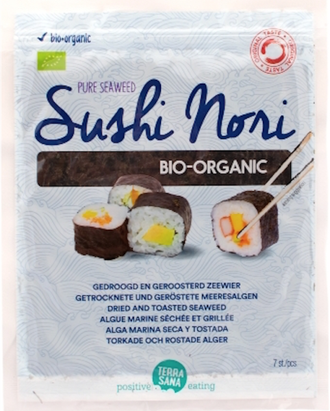Nori ist eine kleinwüchsige Rotalge, die ideal für die Zubereitung von Sushi, Temaki und Reisbällen ist. Die Bio-Nori werden gepresst und kurz geröstet, diese Sushi-Nori aus Süd-Korea sind praktisch die Verpackung vieler Sushi-Gerichte. Nori sind eine gute Quelle für Jod.