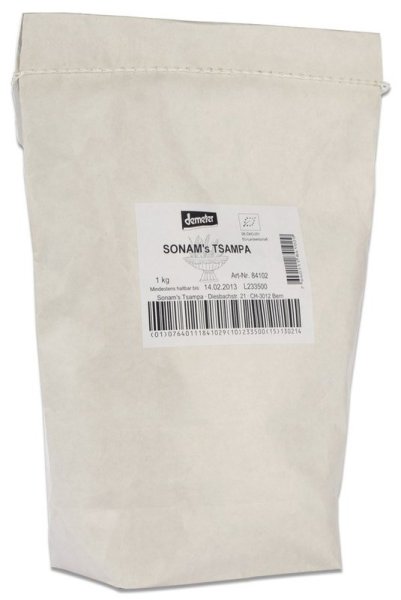 "Das Haupterzeugnis unserer Felder war Gerste. Geröstet und zu einem feinen Mehl gemahlen heißt sie auf Tibetisch Tsampa... Sogar jetzt im Exil esse ich jeden Tag Tsampa. Man isst natürlich nicht das Mehl. Man fügt etwas Flüssigkeit dazu, meistens Tee oder - was mir am besten schmeckt - Milch, auch Joghurt oder gar Chang, tibetisches Gerstenbier, und knetet es mit den Fingern in der Schale zu kleinen Bällchen, die man dann isst. Man kann damit auch Porridge kochen. Tibeter lieben Tsampa..."