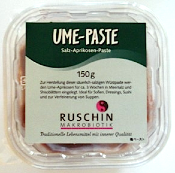 Umeboshi als Paste ist ein salzig-saures Würzmittel für Gemüse, Salatsaucen oder anstelle von Senf. Schmeckt sauer, wirkt aber nicht säurebildend.