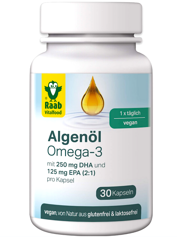 Raab Algenöl Omega 3 Kapseln enthalten Algenöl aus der einzelligen Mikroalge Schizochytrium sp. Das Algenöl wird durch Fermentation der Mikroalge unter kontrollierten Bedingungen gewonnen.